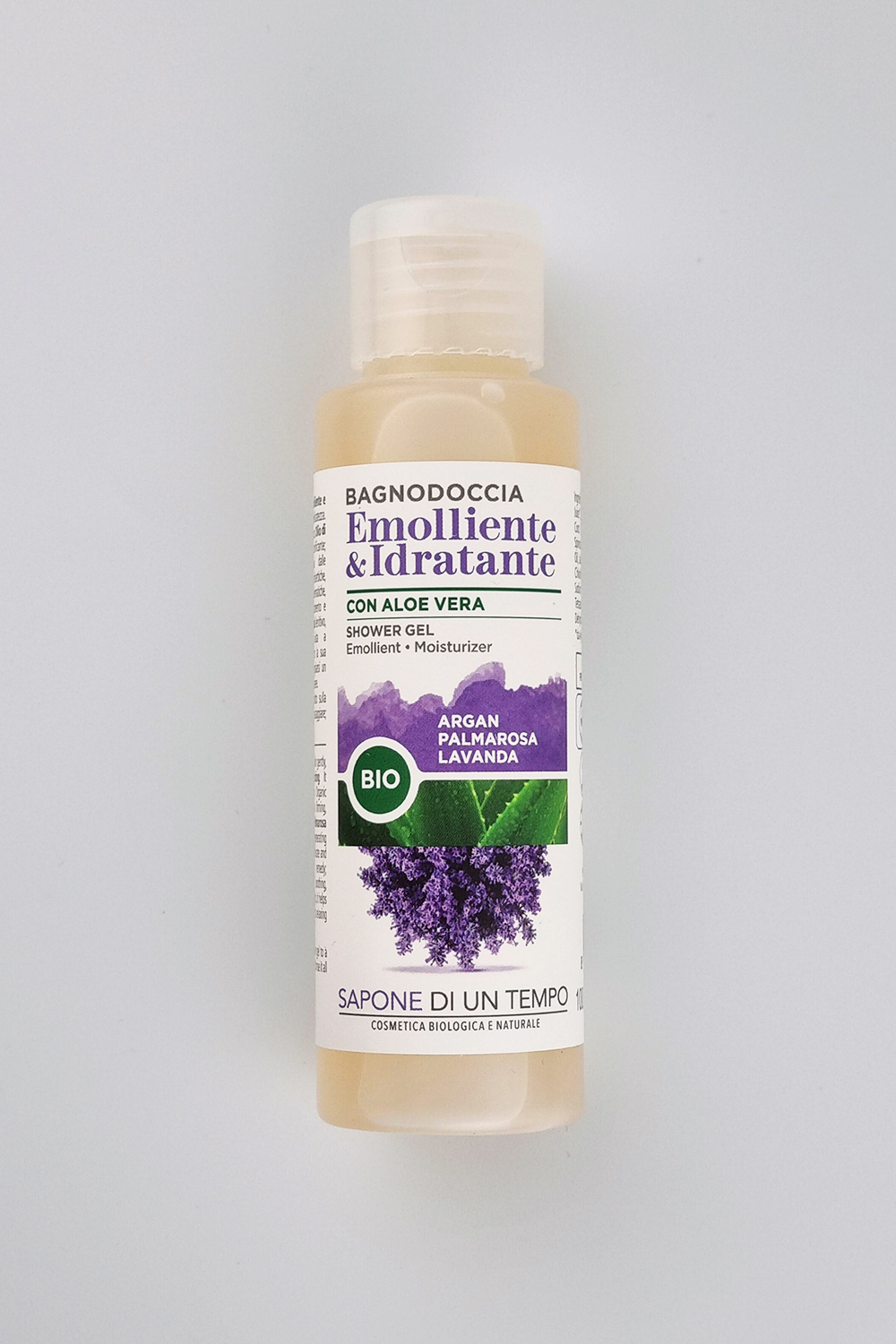Naturalny żel pod prysznic Sapone di un tempo emolientowy i nawilżający z aloesem, olejem arganowym, palmarosą i lawendą w wygodnej wersji podróżnej. Zawiera organiczny sok z aloesu, który działa kojąco i regenerująco, oraz odżywczy olej arganowy o właściwościach antyoksydacyjnych i tonizujących. Olejek eteryczny z palmarosy nawilża, wspomaga odbudowę skóry i działa antyseptycznie, idealnie sprawdzając się przy skórze problematycznej i w okresach zmęczenia lub stresu. Olejek lawendowy łagodzi, działa przeciwzapalnie i pomaga przywrócić równowagę dzięki swojemu relaksującemu aromatowi.