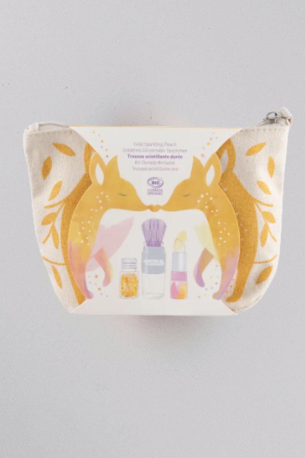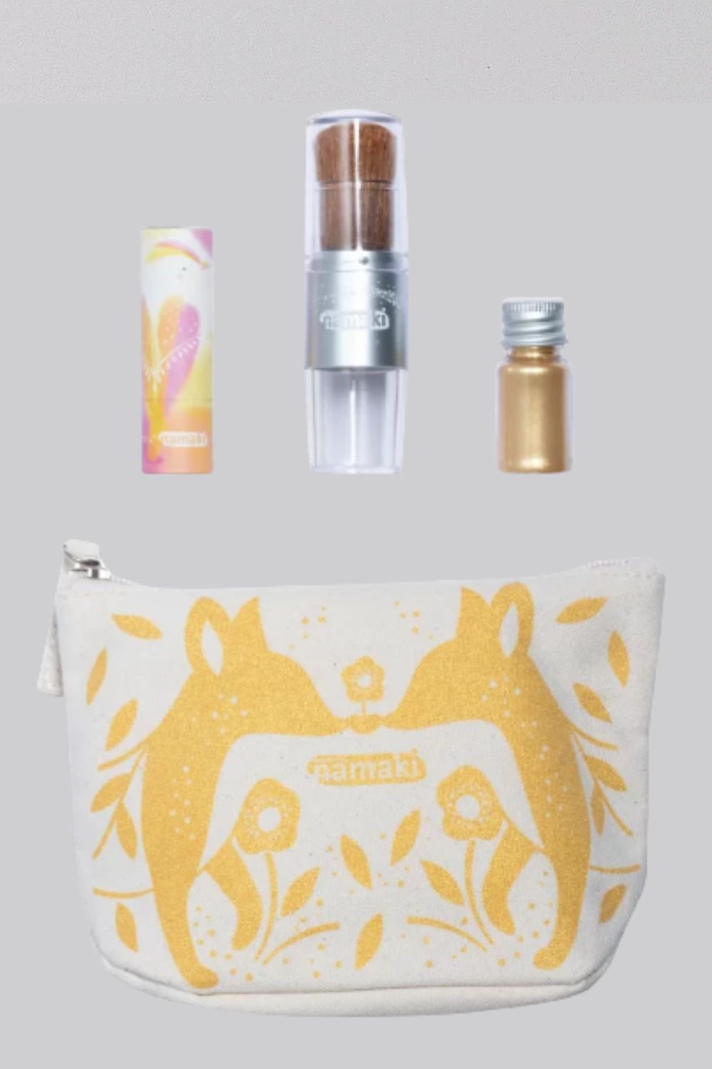 Naturalny zestaw kosmetyków do makijażu dla dzieci marki Namaki w złotej, lśniącej saszetce to idealny pomysł na prezent dla małych księżniczek, które uwielbiają błysk, kreatywną zabawę i odrobinę magii. Ten uroczy zestaw pobudza wyobraźnię, zachęca do tworzenia własnych bajkowych scenariuszy i sprawia, że każda zabawa staje się pełna blasku.