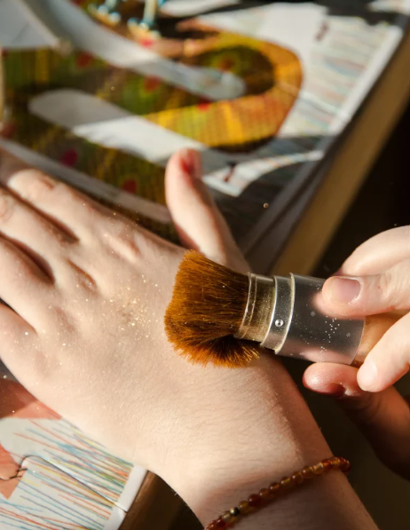 Złoty proszek do ciała i włosów: odkręć dolną część pędzelka i wsyp proszek do pojemnika. Załóż pędzel, zdejmij zakrętkę i lekko potrząśnij, aż pyłek zacznie się wysypywać. Nakładaj na włosy i skórę, tworząc magiczny efekt.