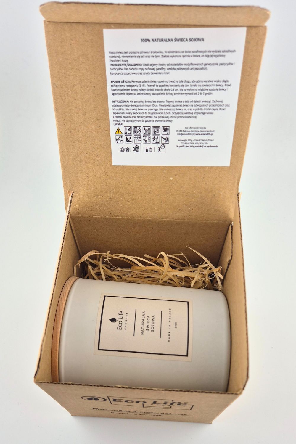 Świeca zapakowana jest w kartonowe pudełeczko wypełnione wełną drzewną.