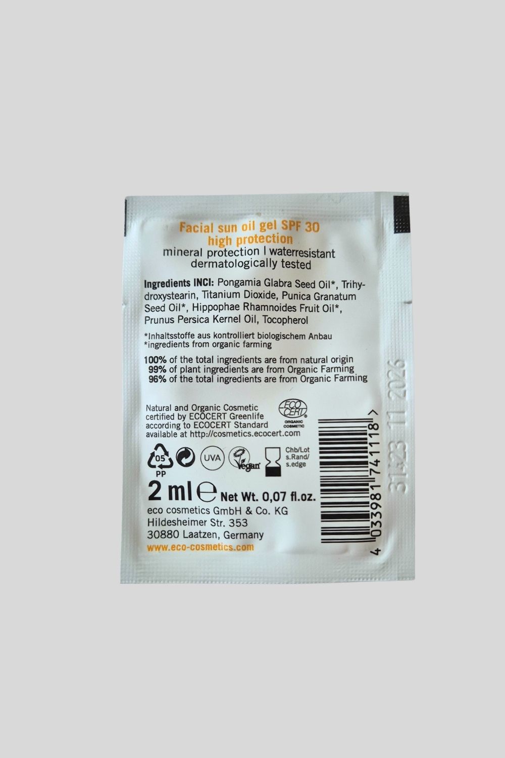 Naturalny żel przeciwsłoneczny SPF30 marki Eco Cosmetics w praktycznej saszetce to idealne rozwiązanie „na wszelki wypadek” – zmieści się w torebce, kieszeni czy kosmetyczce i pozwala zadbać o ochronę skóry zawsze wtedy, gdy jej potrzebujesz.